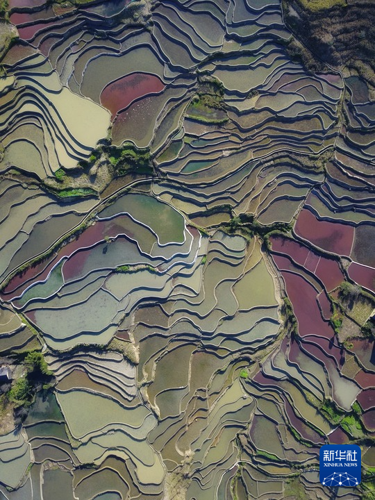 2022年1月3日,地处云南省红河哈尼族彝族自治州元阳县的哈尼梯田蓄水充盈,在阳光的照射下色彩丰富,美不胜收。新华社发(甘与汇摄)