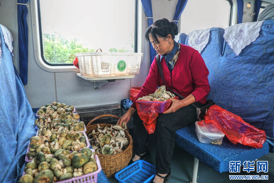 “慢火车”上,一名乘客正在整理摆放自己携带的野生菌(摄于8月24日)。新华网发(杨紫轩 摄)