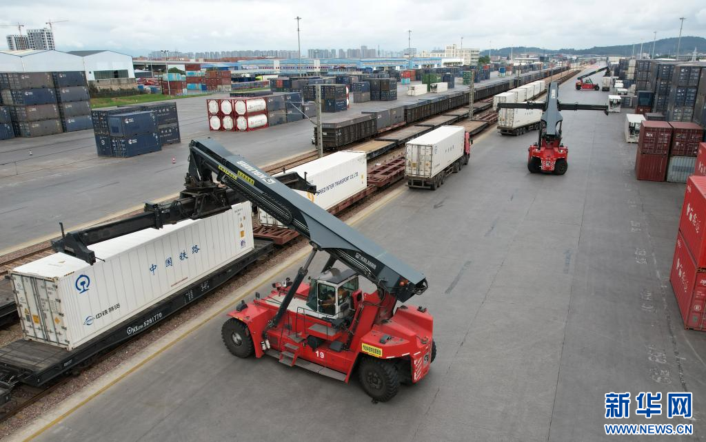 9月21日,集装箱正面起重机在昆明王家营西站卸载装有来自东南亚榴莲的冷藏集装箱(无人机照片)。新华社记者 陈欣波 摄