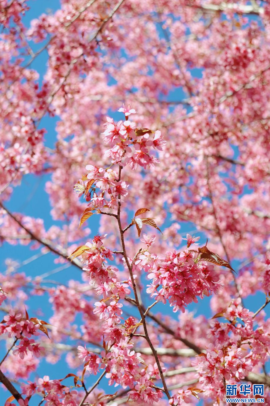 近日,云南省楚雄彝族自治州南华县龙川镇岔河村的冬樱花竞相绽放,蓝天白云下,冬樱花与天空互相映衬,形成一道靓丽的风景线。(李娅洁)