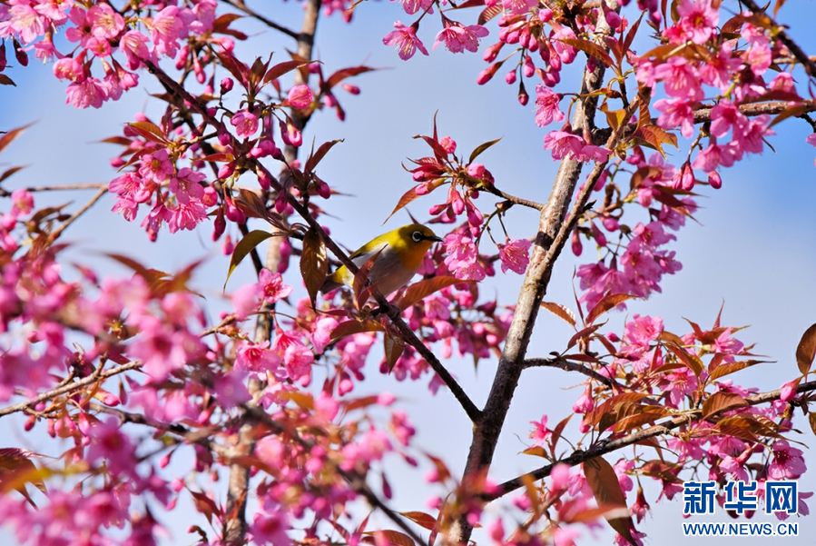 樱花开处鸟欢乐(12月16日摄)。新华网发(吴再忠 摄)