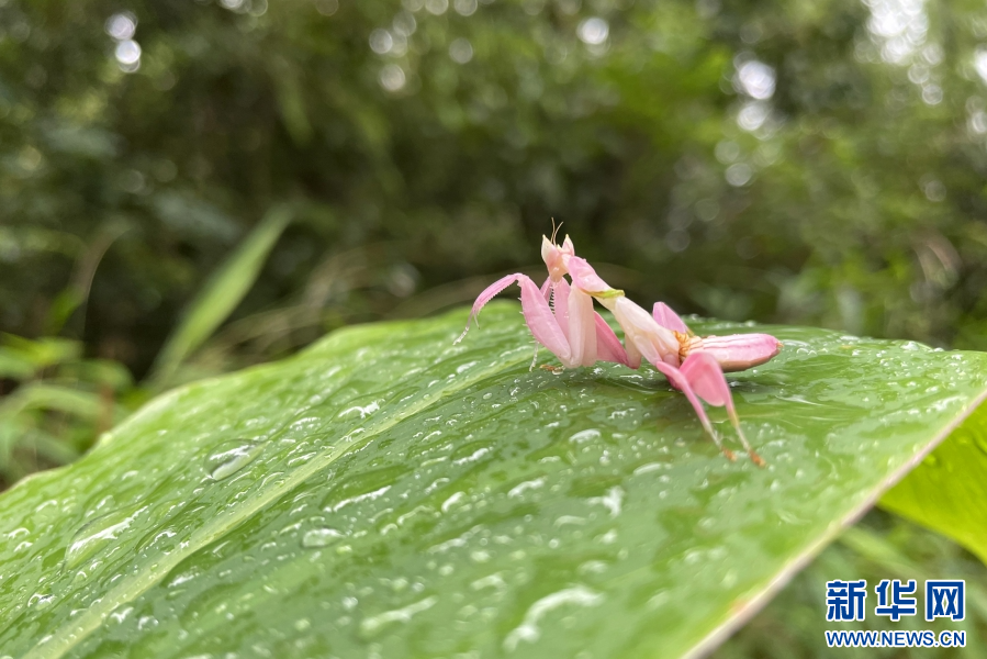 近日,云南省普洱市宁洱县黎明乡窑房村村民李康在回家途中偶遇一只粉红色的螳螂,外形娇艳如兰花,十分漂亮。