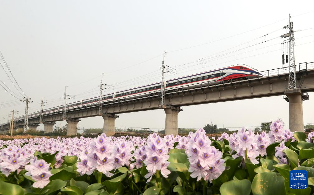 从老挝万象站驶出的D888次“澜沧号”列车行驶在云南省西双版纳州境内的中老铁路橄榄坝特大桥上(2023年4月13日摄)。新华社记者 单宇琦 摄