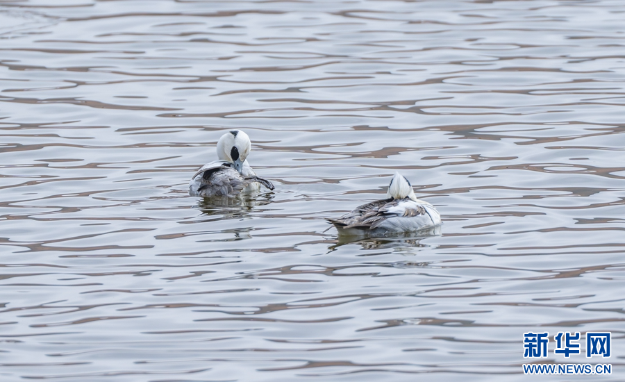 两只斑头秋沙鸭在水中梳理羽毛(1月27日摄)。新华网发(朱边勇 摄)