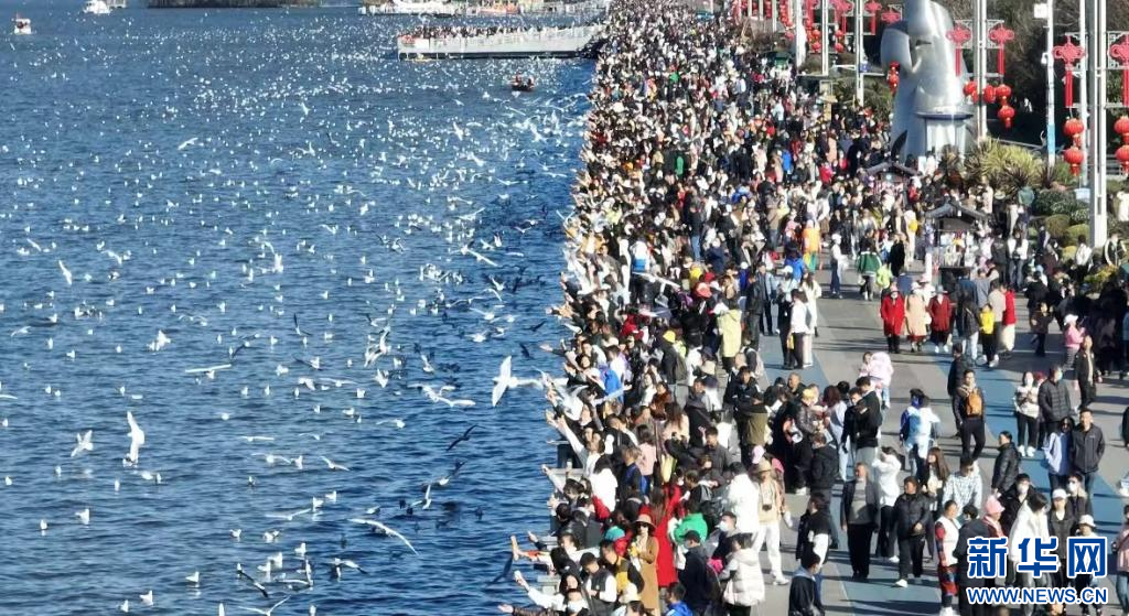 春节假期,市民、游客在昆明滇池海埂大坝喂红嘴鸥。(张继洪 摄)