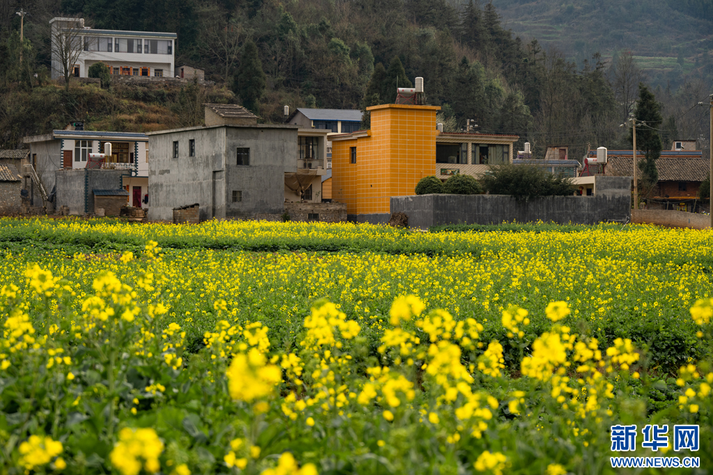 被油菜花环绕的村庄(2月12日摄)。新华网发(刘起 摄)