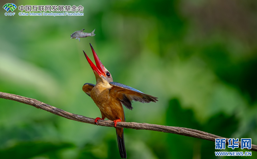 鹳嘴翡翠进食瞬间(3月30日摄)。新华网发(朱边勇 摄)