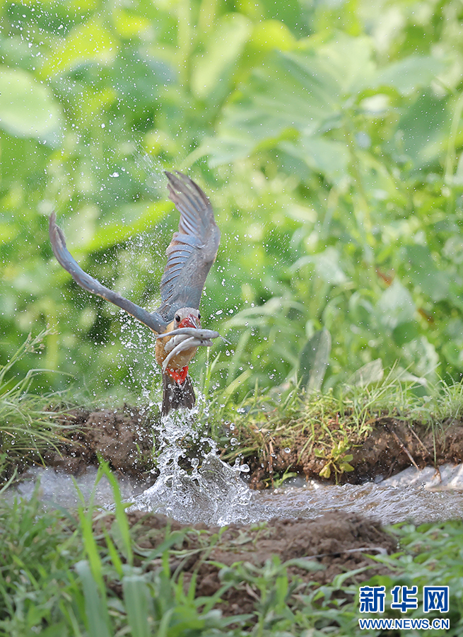 白胸翡翠捕鱼出水瞬间(4月15日摄)。新华网发(杨学飞 摄)