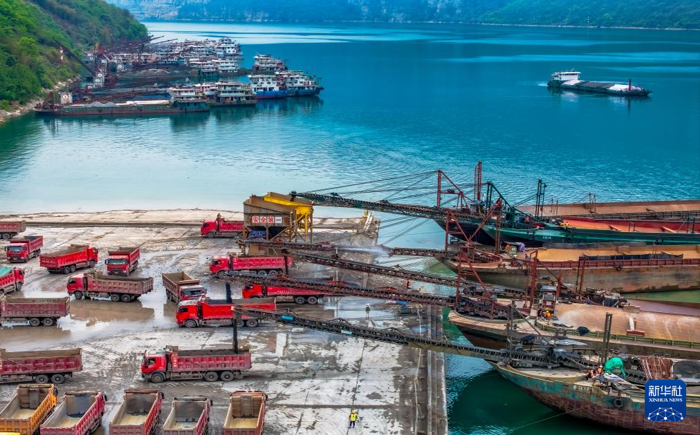 4月20日拍摄的向家坝水电站翻坝转运码头现场(无人机照片)。新华社发(曾三东 摄)