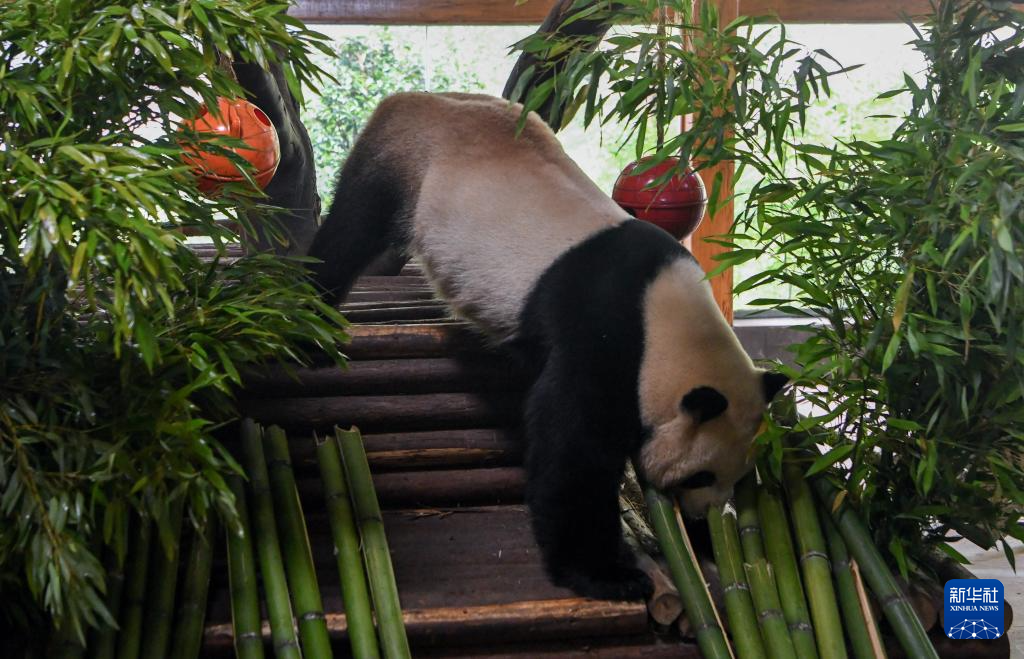 8月2日,大熊猫“珍多”在活动内场玩耍。新华社发(莫欣竹 摄)