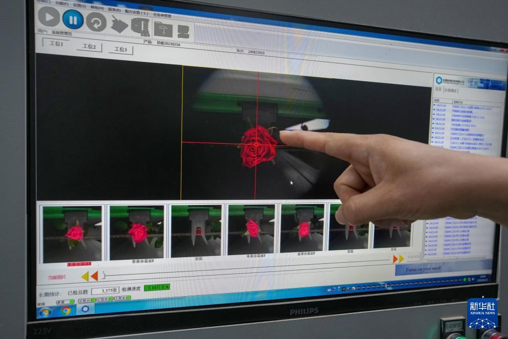 在云南晋宁花卉产业现代化示范园采后处理中心,计算机在实时监测自动分拣流水线上的鲜切花(8月23日摄)。新华社记者 陈欣波 摄