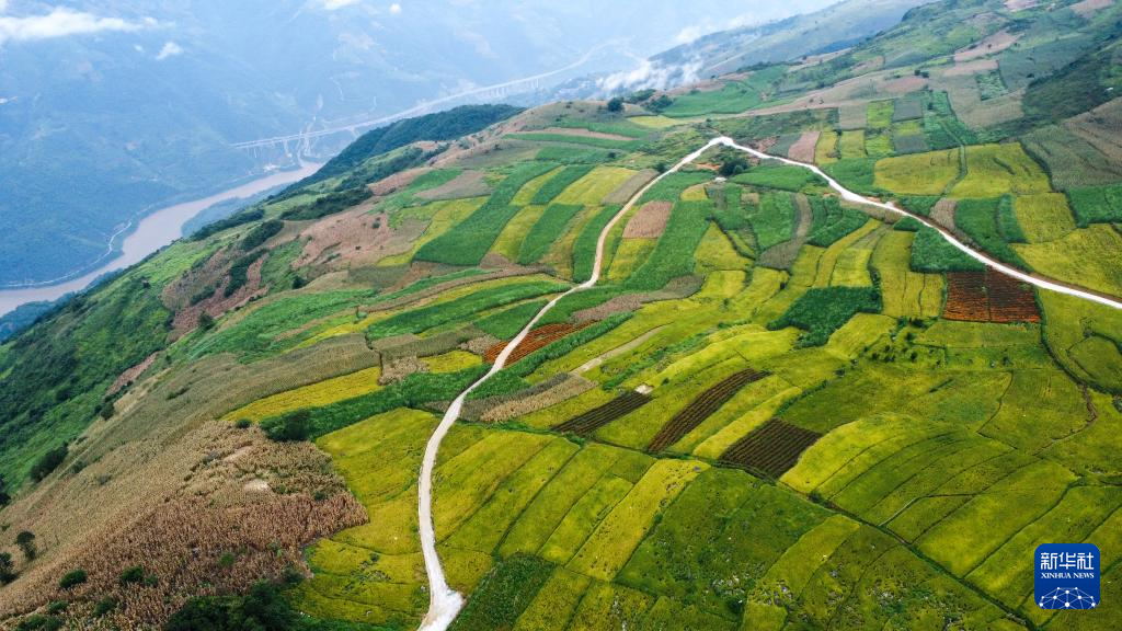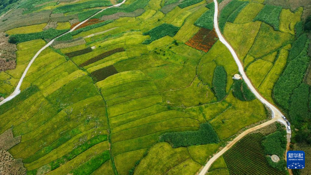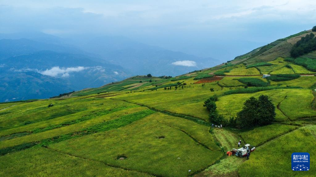 9月20日,当地群众在旱地优质稻种植示范区收割稻谷(无人机照片)。新华社记者 王静颐 摄