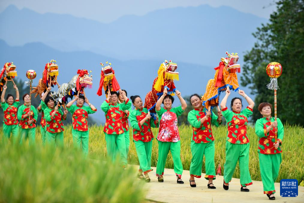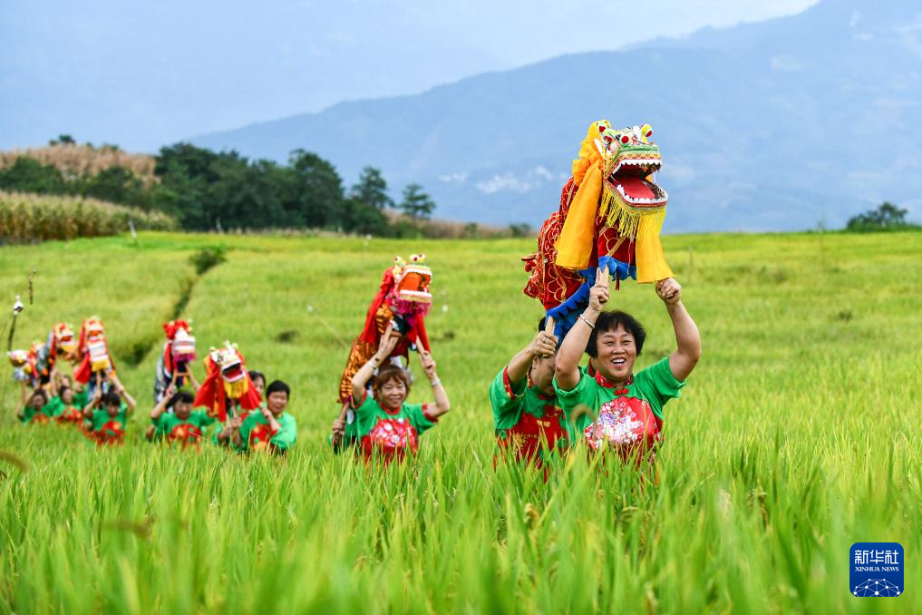 9月20日,在旱地优质稻种植示范区,当地群众抬着板凳龙在田间穿行。新华社记者 王静颐 摄