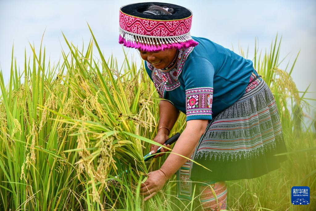 9月20日,在旱地优质稻种植示范区,一名当地妇女在割稻谷。新华社记者 王静颐 摄