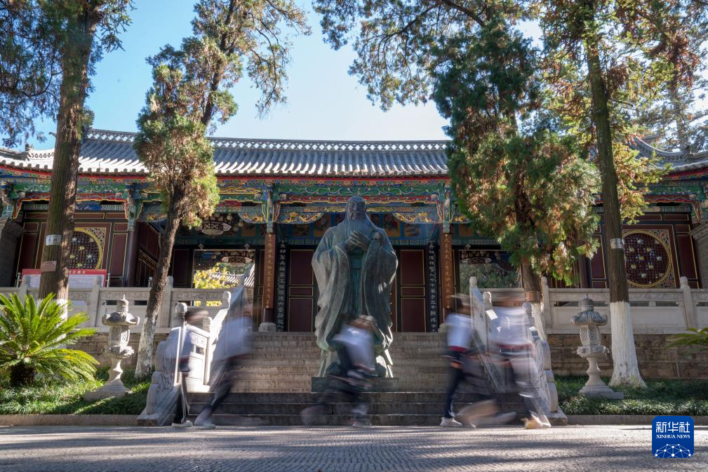 11月12日,在云南省会泽县第一中学,学生们走在校园内的孔子像前。新华社发(彭奕凯 摄)