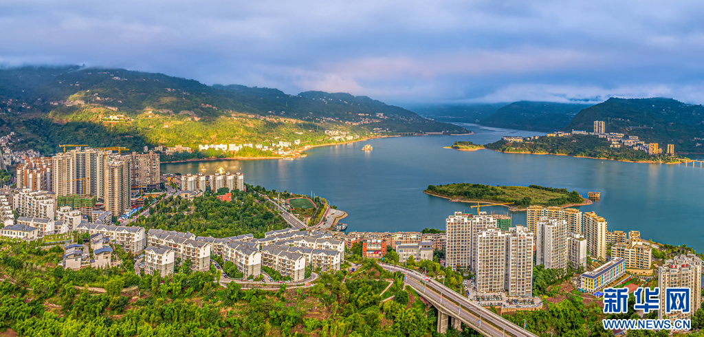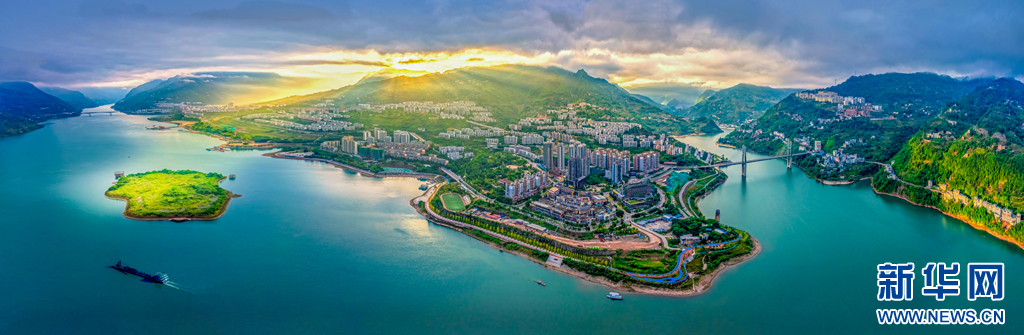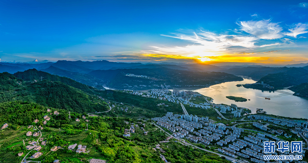 朝阳映衬下的江畔小城绥江,水清岸绿景美(10月23日摄)。新华网发(曾三东 摄)