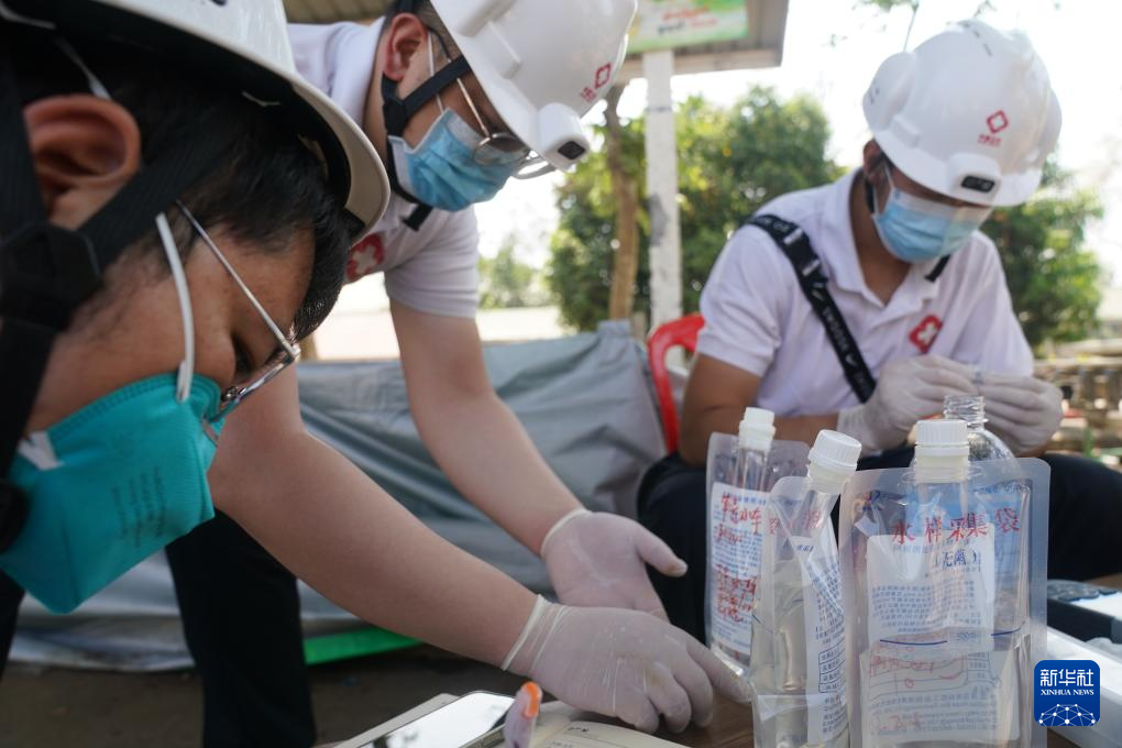 3月31日,在缅甸首都内比都的千床医院,中国云南救援医疗队的疾控专家采集千床医院内的饮用水和生活用水,进行指标分析。新华社发(王申摄)