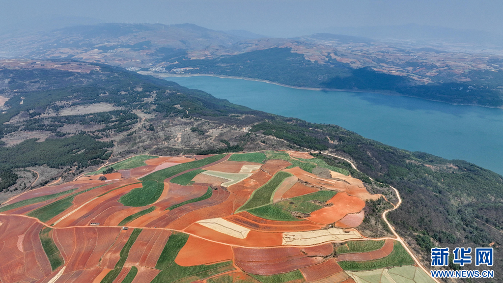 仲春时节,昆明市寻甸回族彝族自治县山地梯田错落有致,无人机视角下,有的田地绿意盎然、生机勃勃,各类农作物旺盛生长;有的田地则经农民翻耕平整后,呈现红褐色。色彩斑斓的梯田,与山道、村庄、水库相映成趣,构成了一幅乡村田园美景图。