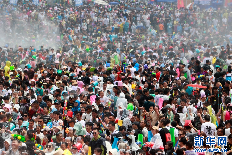 2025年德宏芒市泼水狂欢节上人们互相泼洒祝福(4月12日摄)。新华网发(刘云 摄)