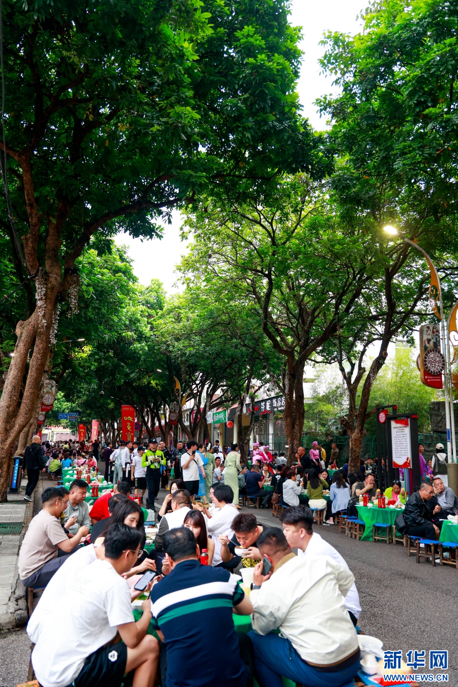 芒市泼水狂欢节系列活动民族团结长街宴(4月11日摄)。新华网发(刘云 摄)