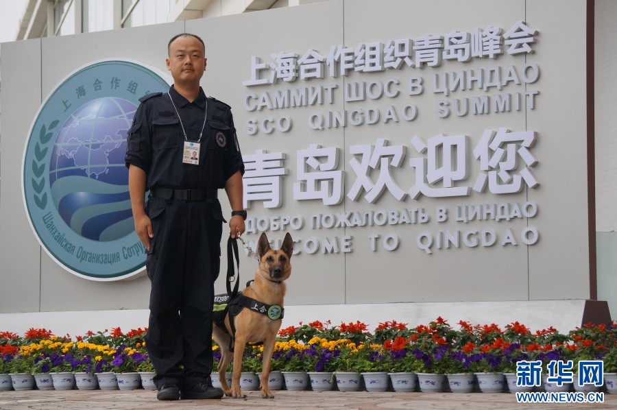 2018年,训导员宋春晖与警犬明拉缘在青岛上合峰会安保留影(资料图)。新华网发(保山市公安局供图)