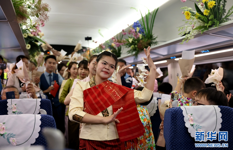 新华网昆明4月18日电(念新洪)4月12日,昆明南至万象的D87次国际旅客列车上欢声笑语,琵琶伴舞《青花瓷》、老挝舞蹈《占芭花开》、傣族舞串烧《如意金湾》等精彩节目轮番上演。列车员还特别准备了印有“复兴号”和“澜沧号”动车组列车图案的蛋糕,与各国旅客一起欢庆中老铁路国际旅客列车开行两周年。