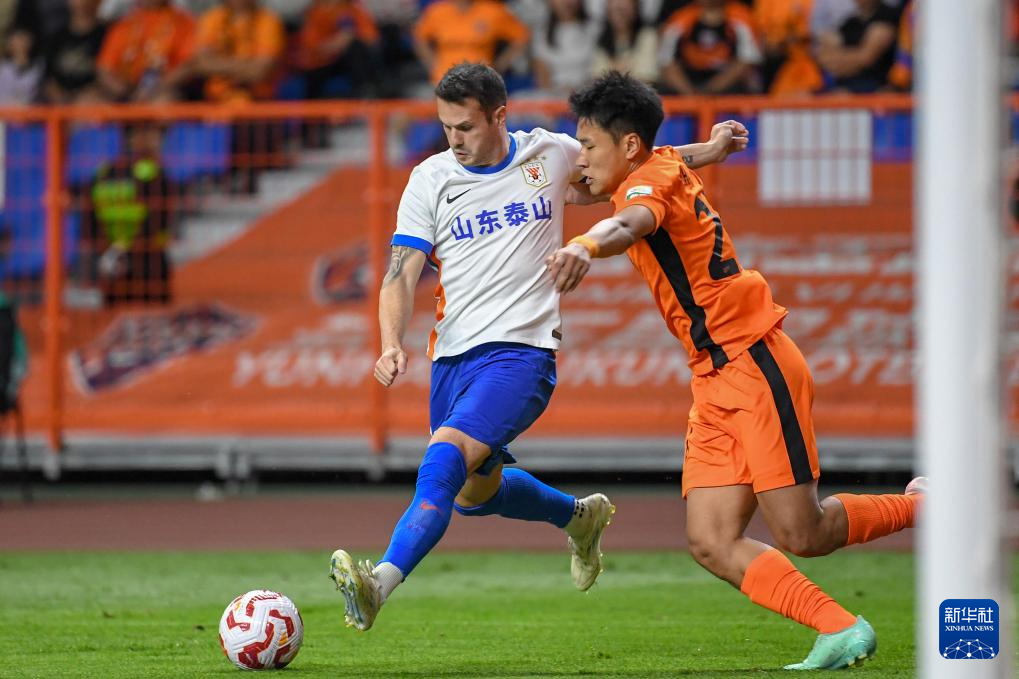 5月5日,山东泰山队球员卡扎伊什维利(左)在比赛中与云南玉昆队球员张宸梁拼抢。新华社发(彭奕凯 摄)