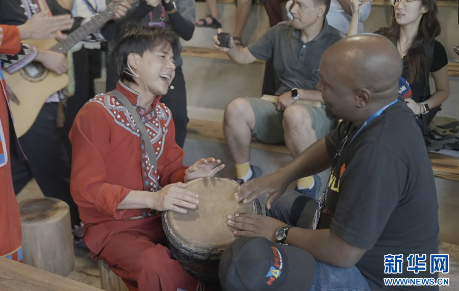 演员和嘉宾共同演奏非洲鼓(9月8日摄)。新华网发(唐诺 摄)