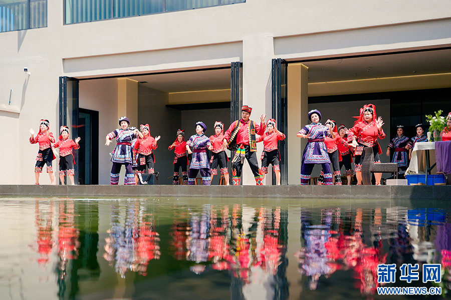 身着民族服饰的工作人员载歌载舞,欢迎远道而来的嘉宾(9月8日摄)。新华网发(张汉超 摄)