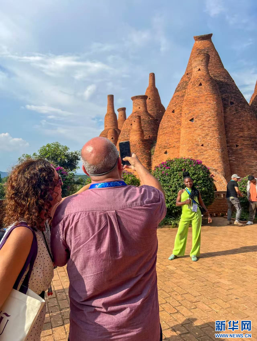 流连于薰衣草花海,徜徉在红砖建筑群,小火车鸣笛驶过,全球南方友人们在弥勒热烈的阳光下,感受着空气中花香、果香、咖啡香的混合香气,频频拍照“打卡”。从“印章”到“万花筒”,艺术气息浓厚的红砖建筑让到访嘉宾印象深刻。