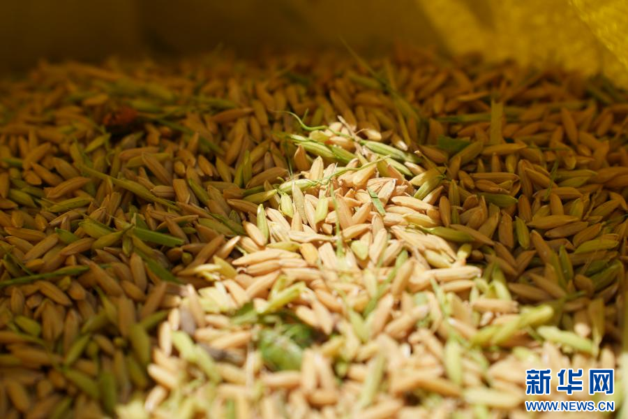 收割机收割后的稻粒(9月7日摄)。新华网发(威信县融媒体中心供图)
