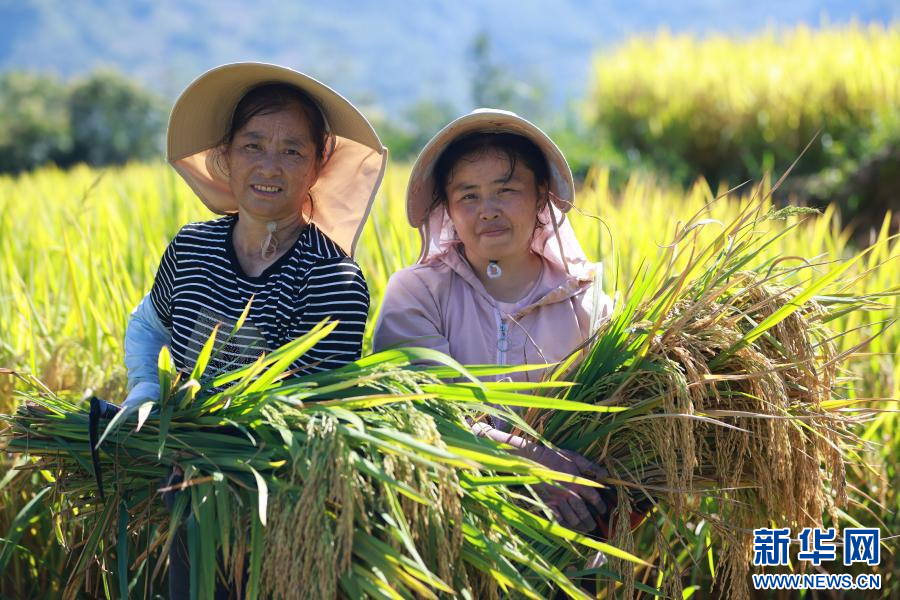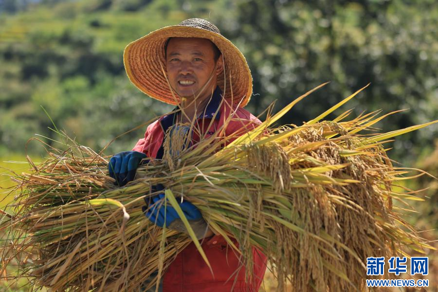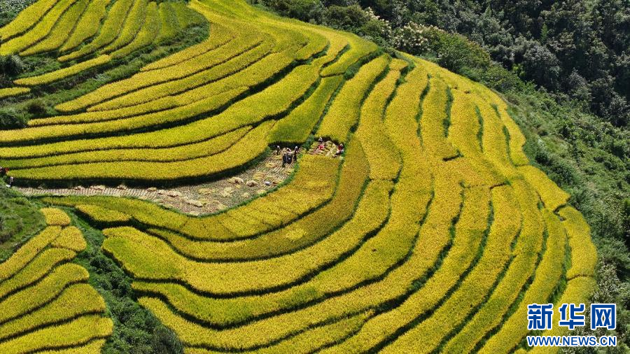 在大关县,村民收割水稻(摄于9月9日)。新华网发(龙梦 摄)