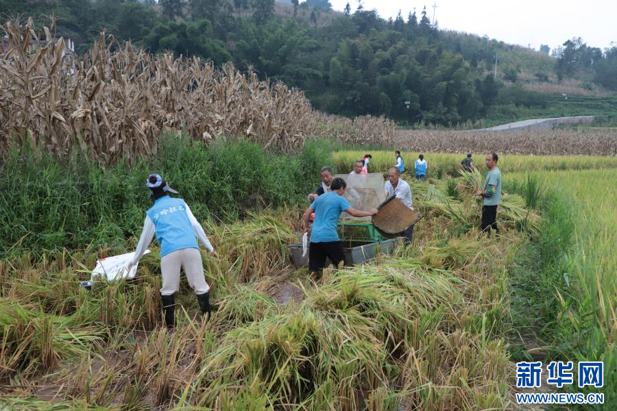 8月28日,水富市云富街道社工与村民帮助特困老人收割稻谷。新华网发(水富市融媒体中心供图)