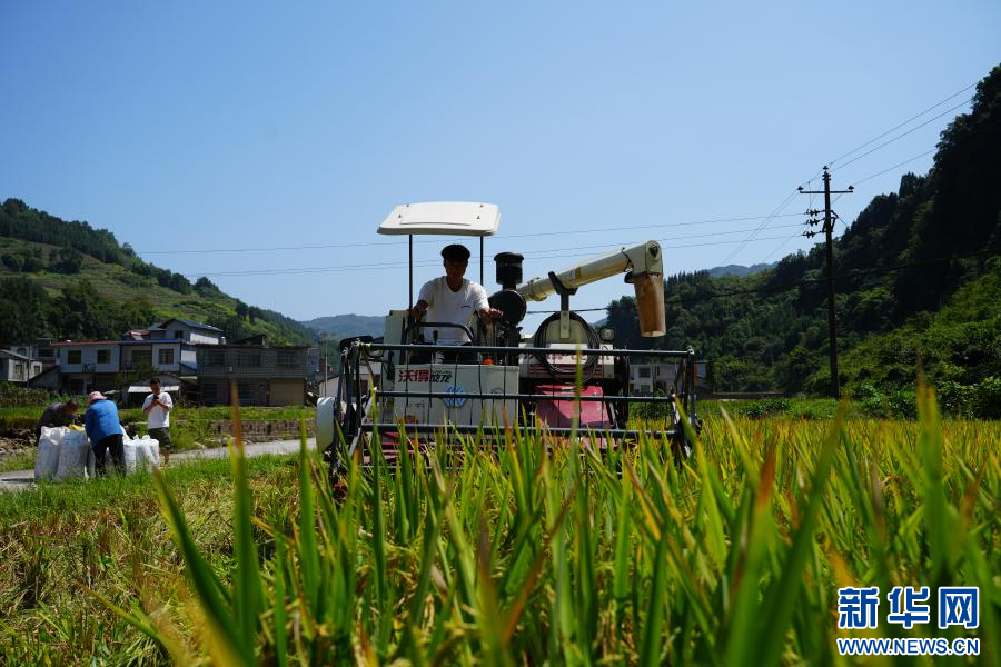 9月7日,威信县旧城镇文兴村,农机手正操作收割机收割水稻。新华网发(威信县融媒体中心供图)