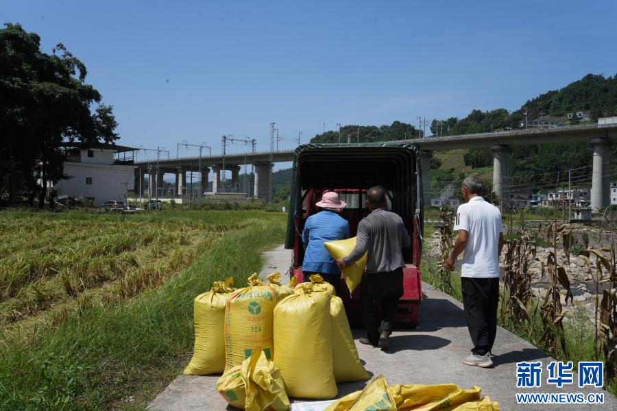 9月7日,威信县旧城镇文兴村水稻丰收,农户正在将收割机收割好的稻谷转运至晒场。新华网发(威信县融媒体中心供图)