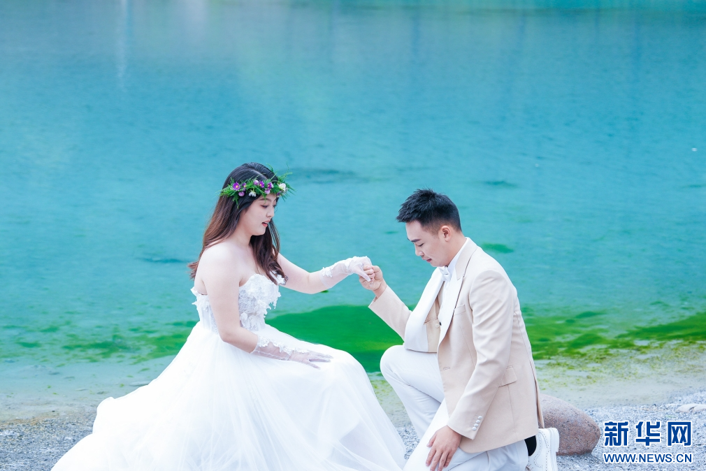 游客在丽江蓝月谷拍摄婚纱照(9月8日摄)。新华网发(徐俊 摄)