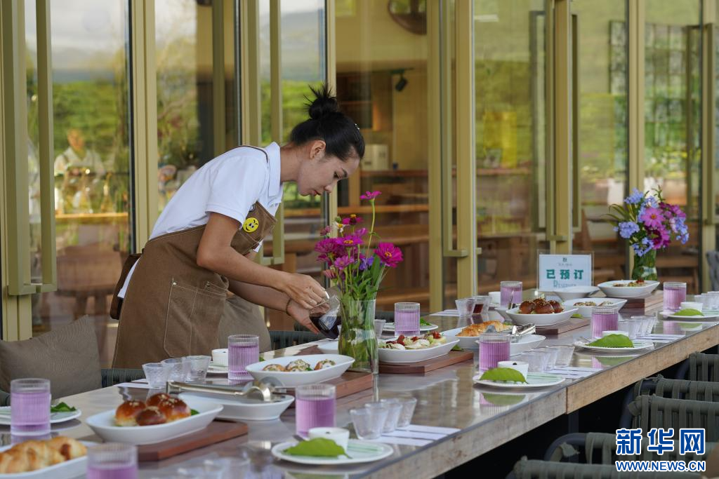 工作人员在白沙坡村民小组“美丽星村·有风咖谷”咖啡体验中心为游客准备咖啡和特色餐点(9月17日摄)。新华网发(高咏薇 摄)