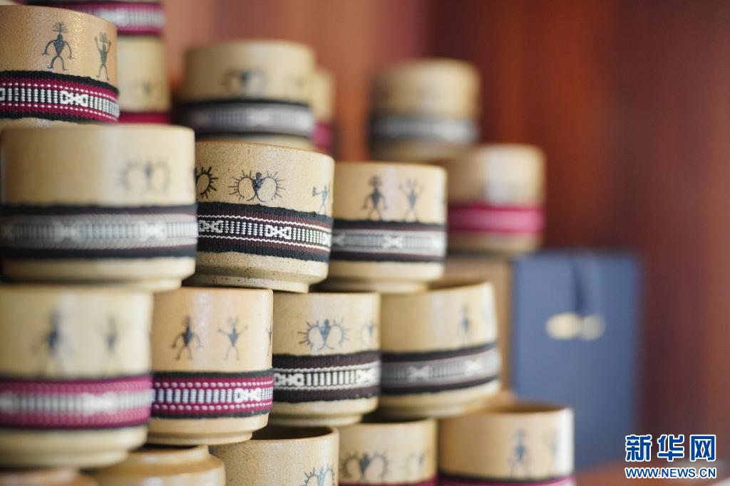 这是在白沙坡村民小组佤族织锦工坊拍摄的带有佤族织锦装饰的咖啡杯(9月17日摄)。新华网发(高咏薇 摄)