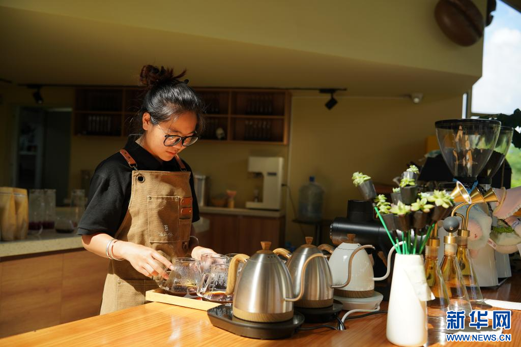 工作人员在白沙坡村民小组“美丽星村·有风咖谷”咖啡体验中心制作咖啡(9月17日摄)。新华网发(高咏薇 摄)