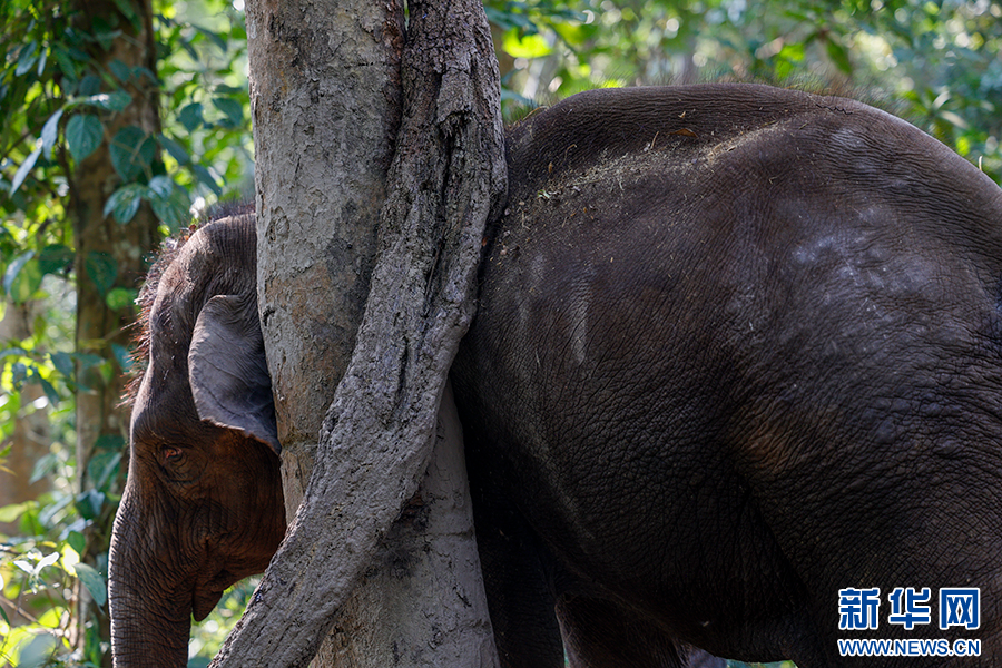 亚洲象来回蹭树,为肩部止痒(3月11日摄)。新华网发(徐华陵 摄)
