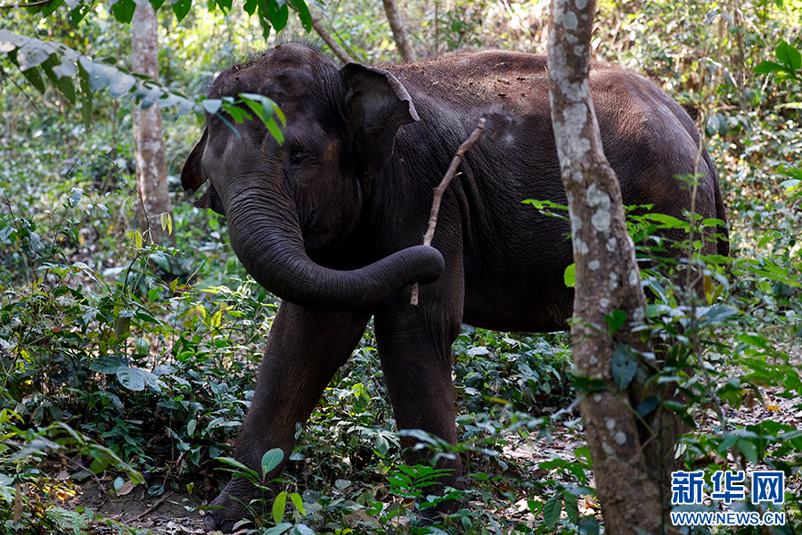 亚洲象用鼻子卷起树枝,戳向皮肤达到止痒效果(3月11日摄)。新华网发(徐华陵 摄)