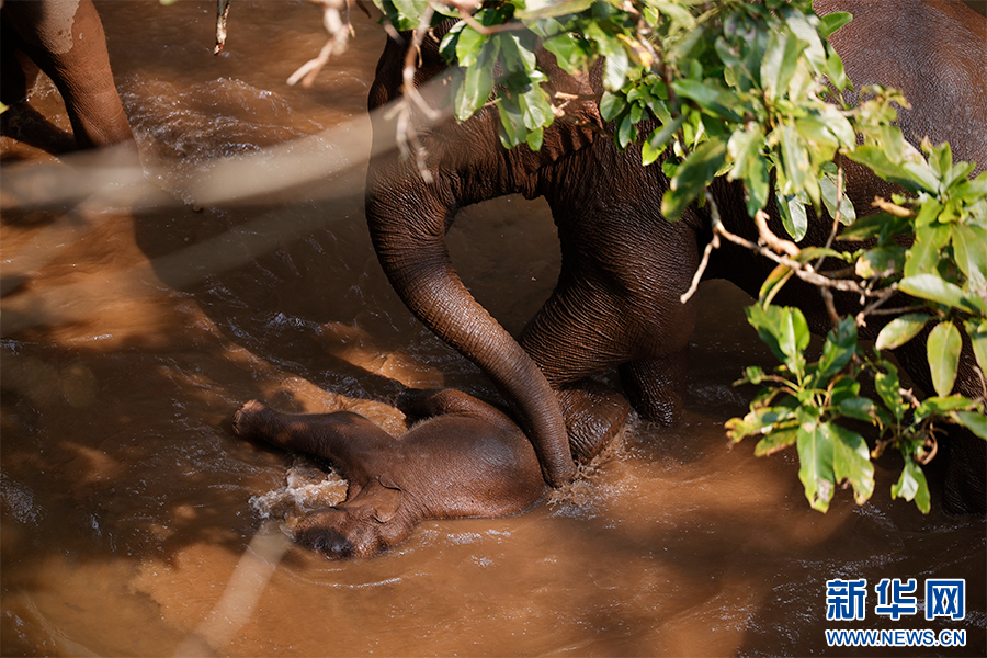 在河流里洗澡的野生亚洲象(3月4日摄)。新华网发(徐华陵 摄)
