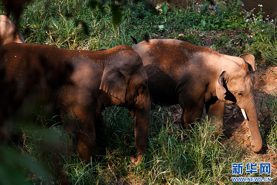亚洲象用泥土覆盖身体,防止蚊虫叮咬(3月4日摄)。新华网发(徐华陵 摄)