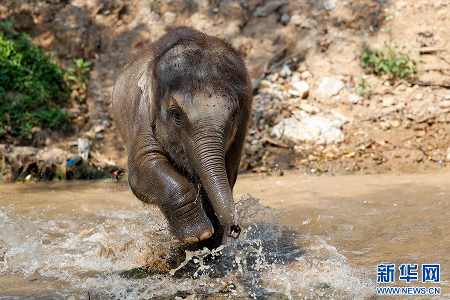 亚洲象幼象正在愉快玩水(3月11日摄)。新华网发(徐华陵 摄)