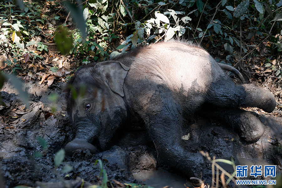 一头幼象在泥塘里打滚(3月5日摄)。新华网发(徐华陵 摄)