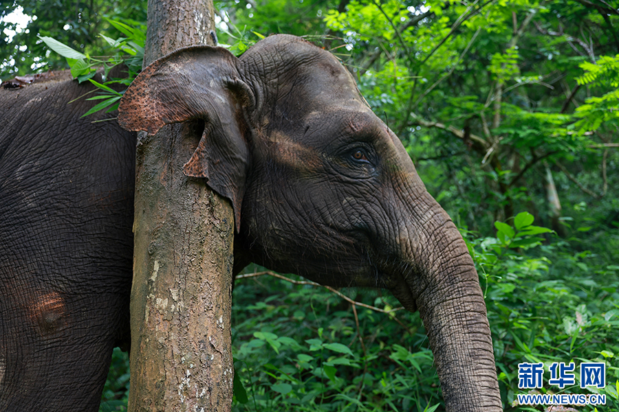 亚洲象正在野外蹭树,研究人员可根据它留下的痕迹判断大致身高等信息(6月24日摄)。新华网发(徐华陵 摄)