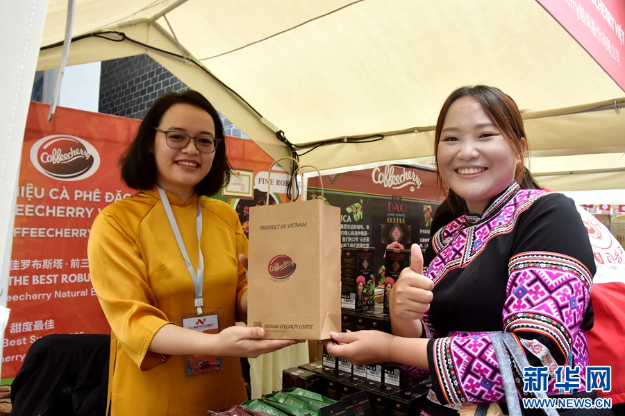 首届中越(红河)咖啡节展会现场,逛展民众购买越南咖啡(摄于9月27日)。新华网发(薛莹莹 摄)