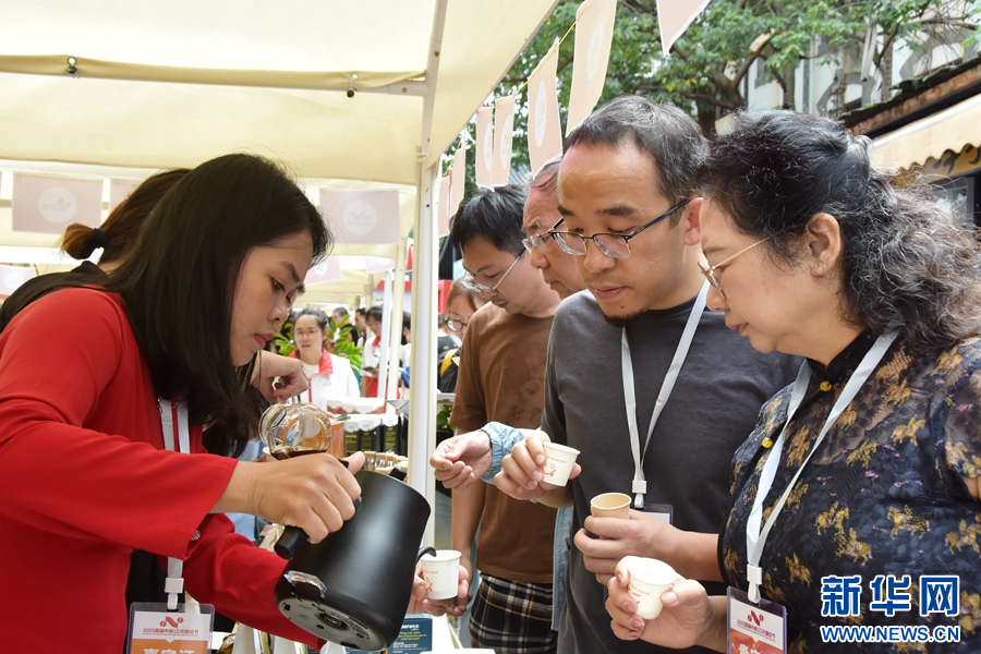首届中越(红河)咖啡节展会现场,参会嘉宾和逛展民众在一家越南企业的展台前品尝咖啡(摄于9月27日)。新华网发(薛莹莹 摄)