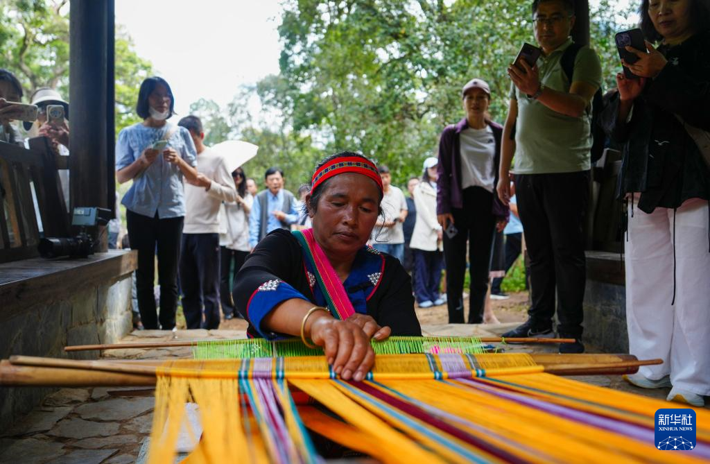 9月27日,一名当地村民在景迈山大平掌古茶园为游客展示织锦技艺。新华社记者 陈欣波 摄