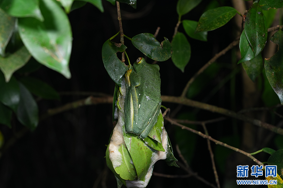 趴在树叶上的黑蹼树蛙,下面则是卵泡(资料图)。新华网发(张鹏 摄)